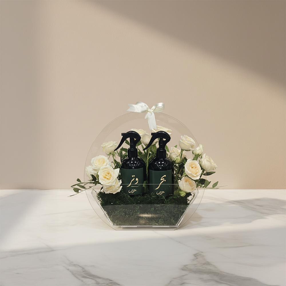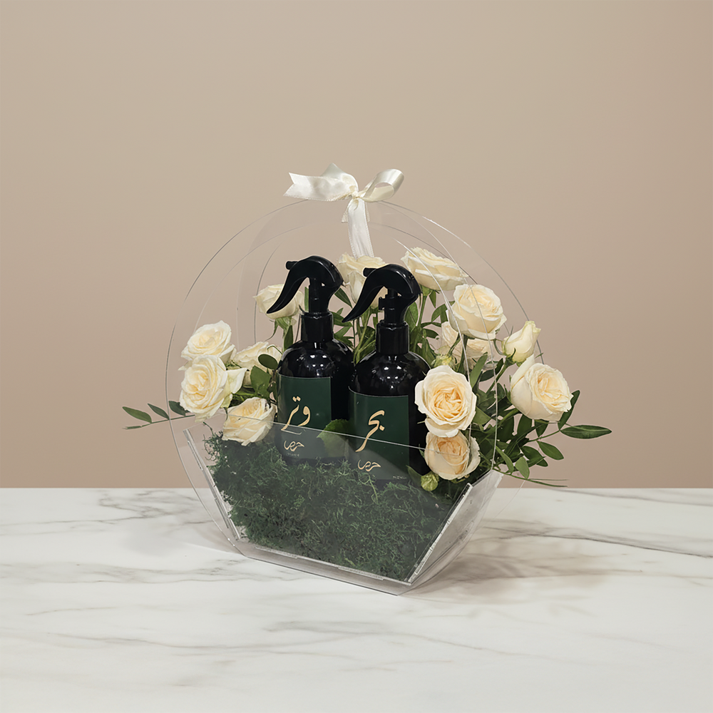 أضف لمسة من الأناقة والجمال إلى منزلك مع هذه المجموعة الفاخرة التي تضمّ معطرين منزليين وباقة زهور منسقة بعناية، جميعها مُقدّمة في سلة أكريليك أنيقة. تُضفي كل زهرة لمسة جمالية ساحرة، بينما يملأ المعطر الغرفة برائحة آسرة. إنها الهدية المثالية لإضفاء الرقي والفخامة على أي منزل أو مناسبة.